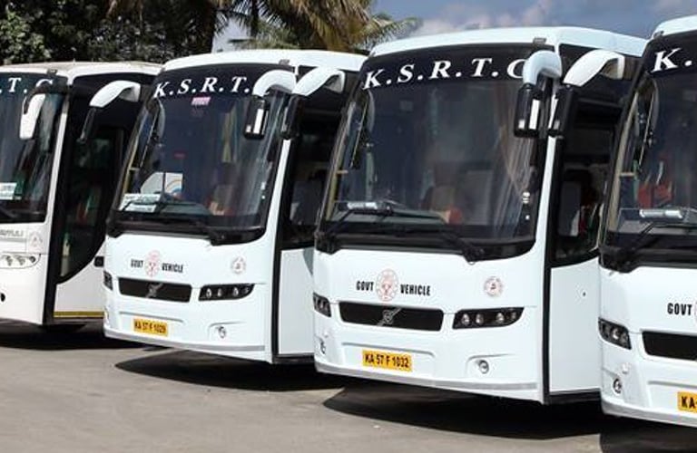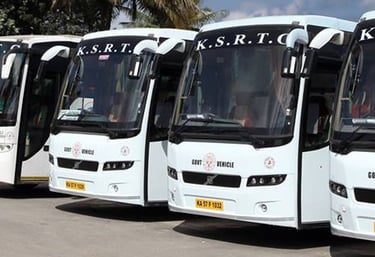 A vibrant KSRTC bus wrapped with colorful branding in bustling Bengaluru streets.
